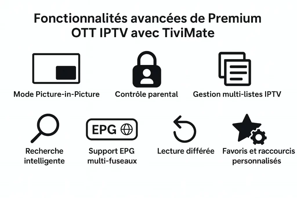 Elle est particulièrement appréciée des utilisateurs OTT Premium car elle facilite la gestion de playlists, l’organisation des chaînes et la personnalisation de l’expérience TV.